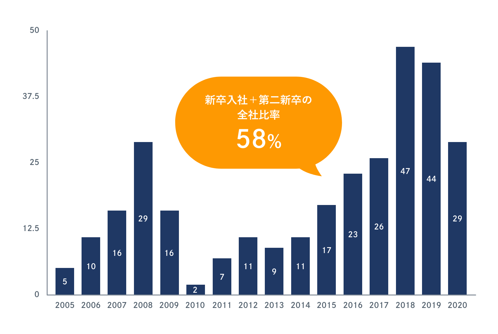 2005年度より今にいたるまで継続的に新卒採用を行っています。デジタル・ネイティブ世代を積極的に採用し、市場で不足しがちなデジタル人材の育成とともに成長を促すことで持続可能な事業運営を行えるように体制を強化しています。