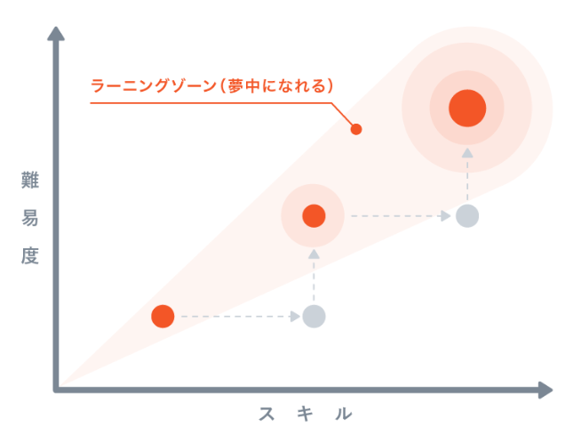 アピリッツでは、意図的に”夢中”をつくり出す仕組みがあります。1on1による日々のヒアリングをもとに、メンバーが最適な難易度のプロジェクトに取り組むことができます。難しすぎず簡単すぎない、夢中になれるラーニングゾーンを持続し、「次々と主体的にチャレンジできる環境」=「チャンスをつくること」を大切にしています。